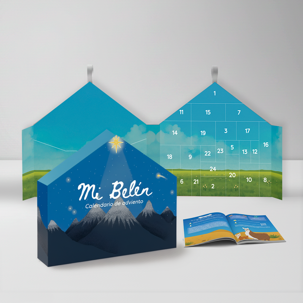 Contiene un tablero con 24 espacios que se van completando diariamente con autoadhesivos que componen una imagen. Además, cuenta con un libro que guía este proceso a través de cuentos, reflexiones, cantos y adivinanzas para cada día.